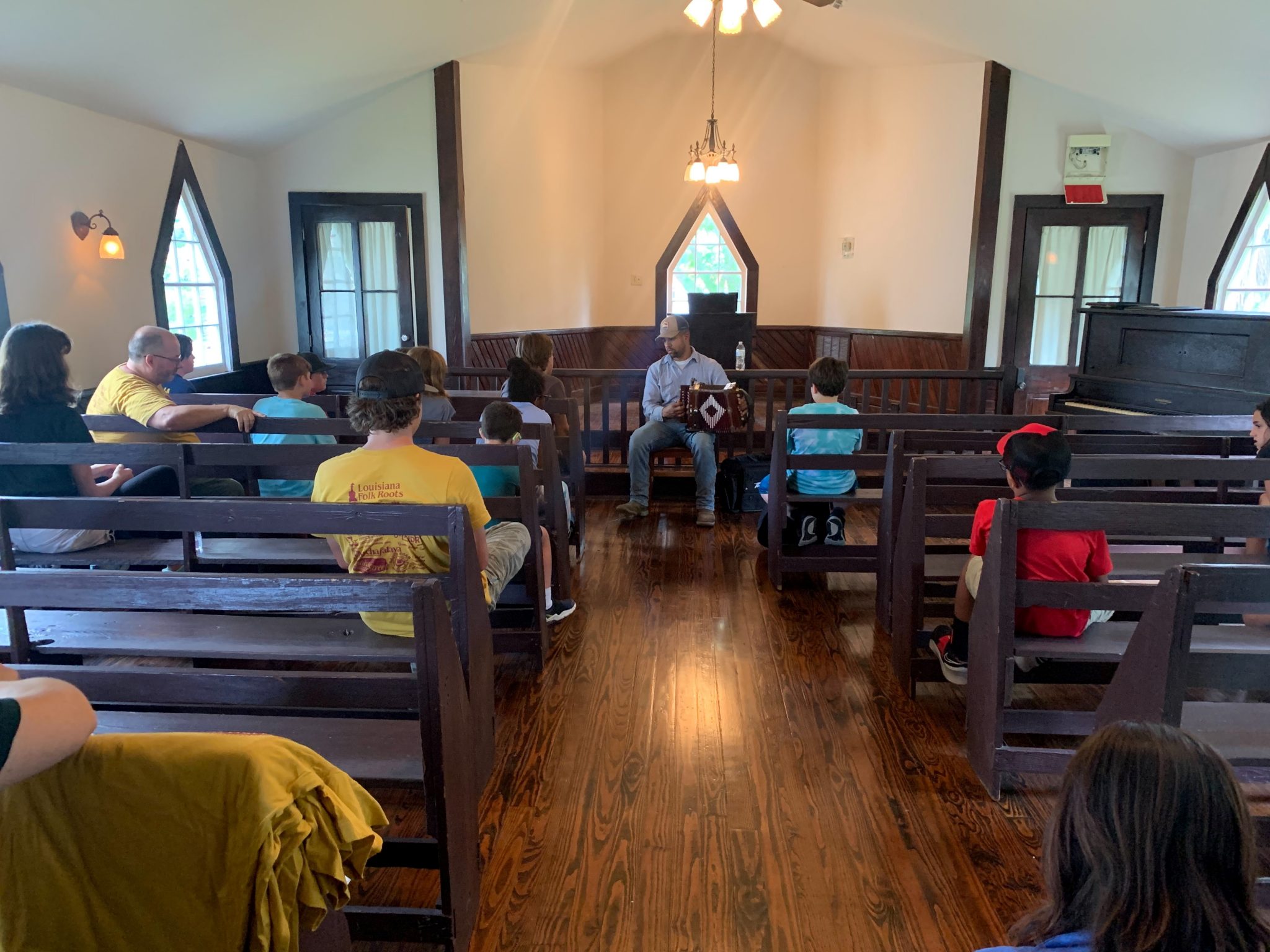 (Opelousas, LA) – Le Vieux Village de Poste des Opelousas is the setting this week for Louisiana Folk Roots Kids Cajun and Creole Music Camp. For the remainder of the week, kids will take part in a variety of creative and fun activities provided by a gifted group of music instructors. One of those activities on Monday included an afternoon accordion session with Creole Zydeco musician Joseph Wayne Singleton of Wayne and Same Ol’ 2 Step.